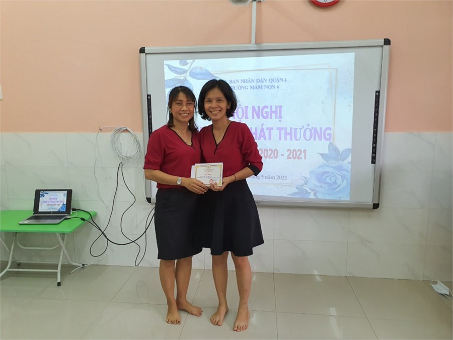 Bà Hoàng Thị Định - Phó Hiệu trưởng nhà trường trao tặng khen thưởng cho giáo viên có trẻ đạt giải phong trào quận