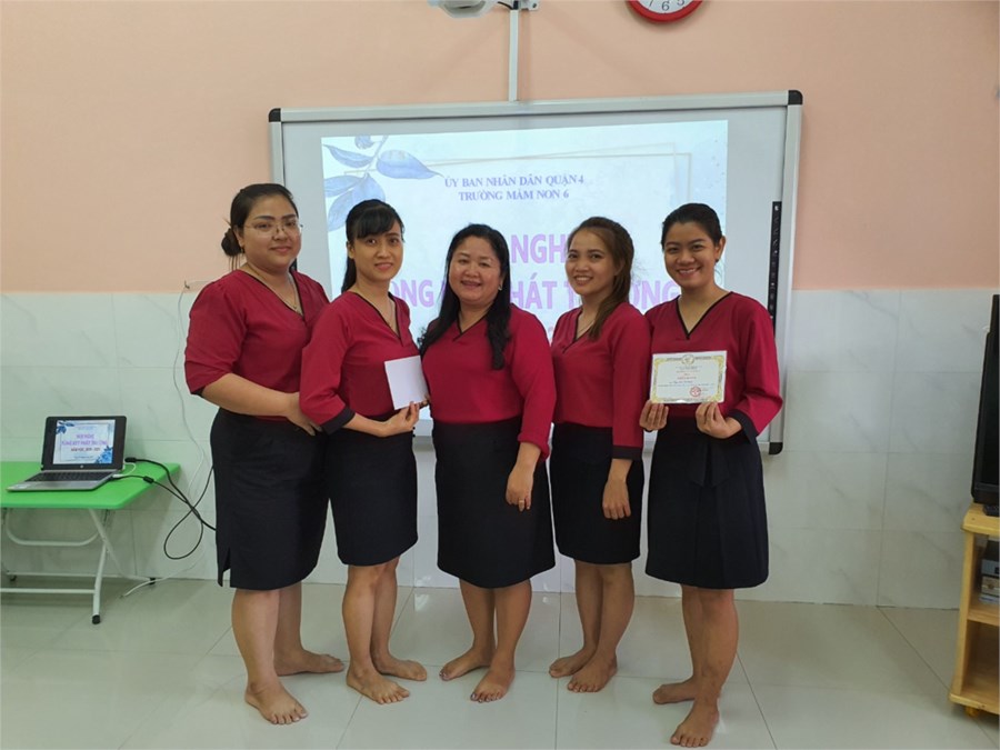 Bà Lê Phương Trinh - Hiệu trưởng nhà trường trao tặng khen thưởng Tập thể nổi trội cho Tổ Chồi.